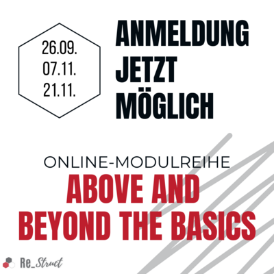 Basierend auf den gefragtesten Workshops unserer Fachtagung 2023 "Beyond the Basics" bieten wir dieses Jahr die Online-Modulreihe "Above and Beyond the Basics" an! Die Workshops bieten die Chance, noch tiefer in wichtige Themen einzutauchen oder überhaupt die Möglichkeit zu haben, daran teilzunehmen.